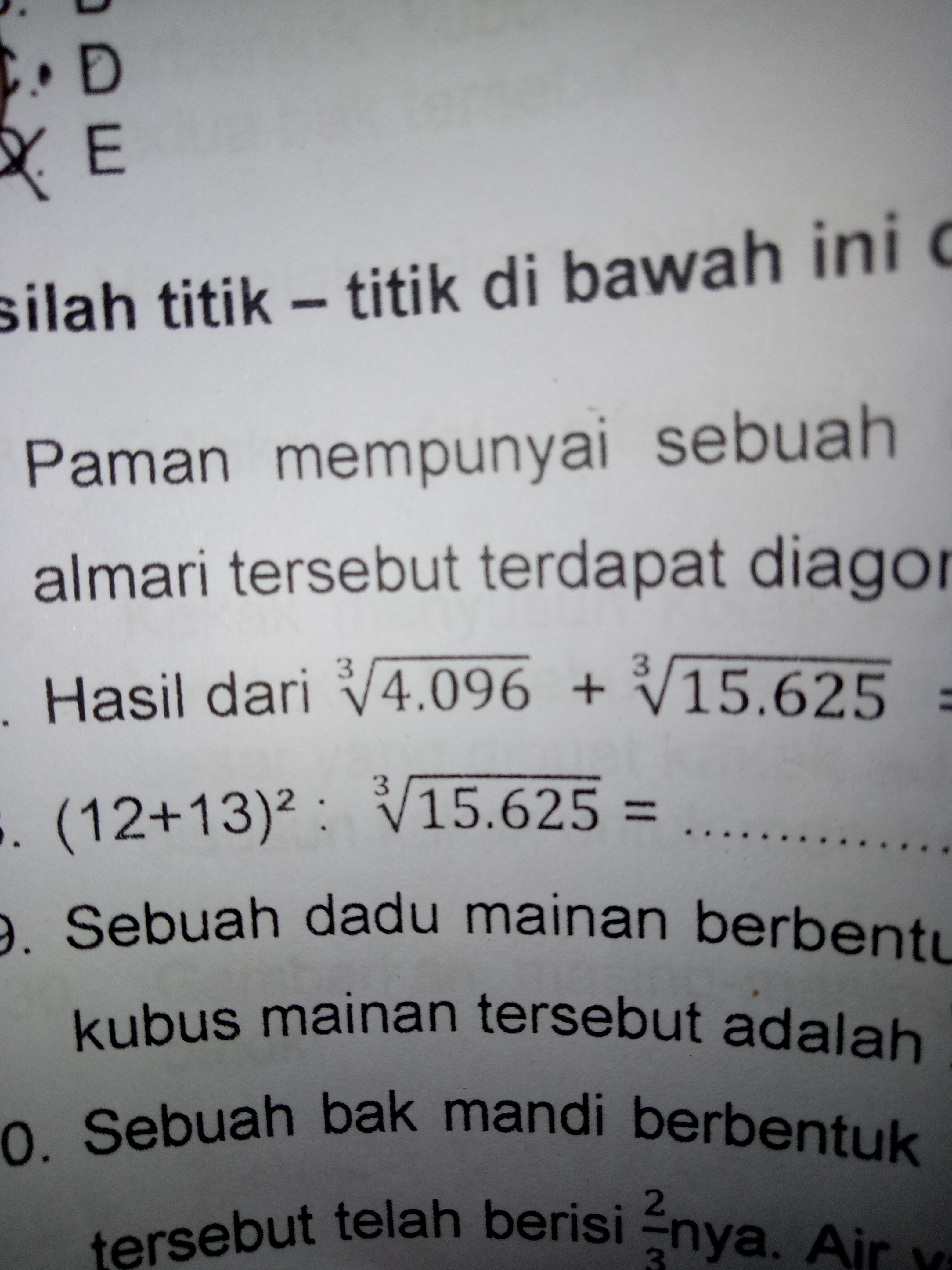 Juga merupakan hasil perkalian suatu bilangan dengan hasil kuadratnya: Akar pangkat 3 dari 4096 adalah 16. Untuk lebih jelasnya perhatikan contoh berikut ini. Jan 23, 2015 · 25 pangkat 3/2 = √25 pangkat 3 = √15625 = 125. Terimakasih telah berkunjung dan semoga dapat bermanfaat. Khususnya untuk mencari volume kubus. Disekeliling taman kota akan dipasang lampu taman dengan jarak setiap lampu 5 m. A × a × a = hasil perpangkatan atau perkalian berulang. N 3 = n × n × n. Hasil dari perpangkatan 3 disebut dengan bilangan kubik. Jan 13, 2019 · akar pangkat 3 dari 15625 adalah 25. O2z1qpv dan 127 orang menganggap jawaban ini membantu. Akar pangkat 3 dari 15625 dikali akar pangkat 3 dari 4096 dikurangi akar pangkat 3 dari 125.